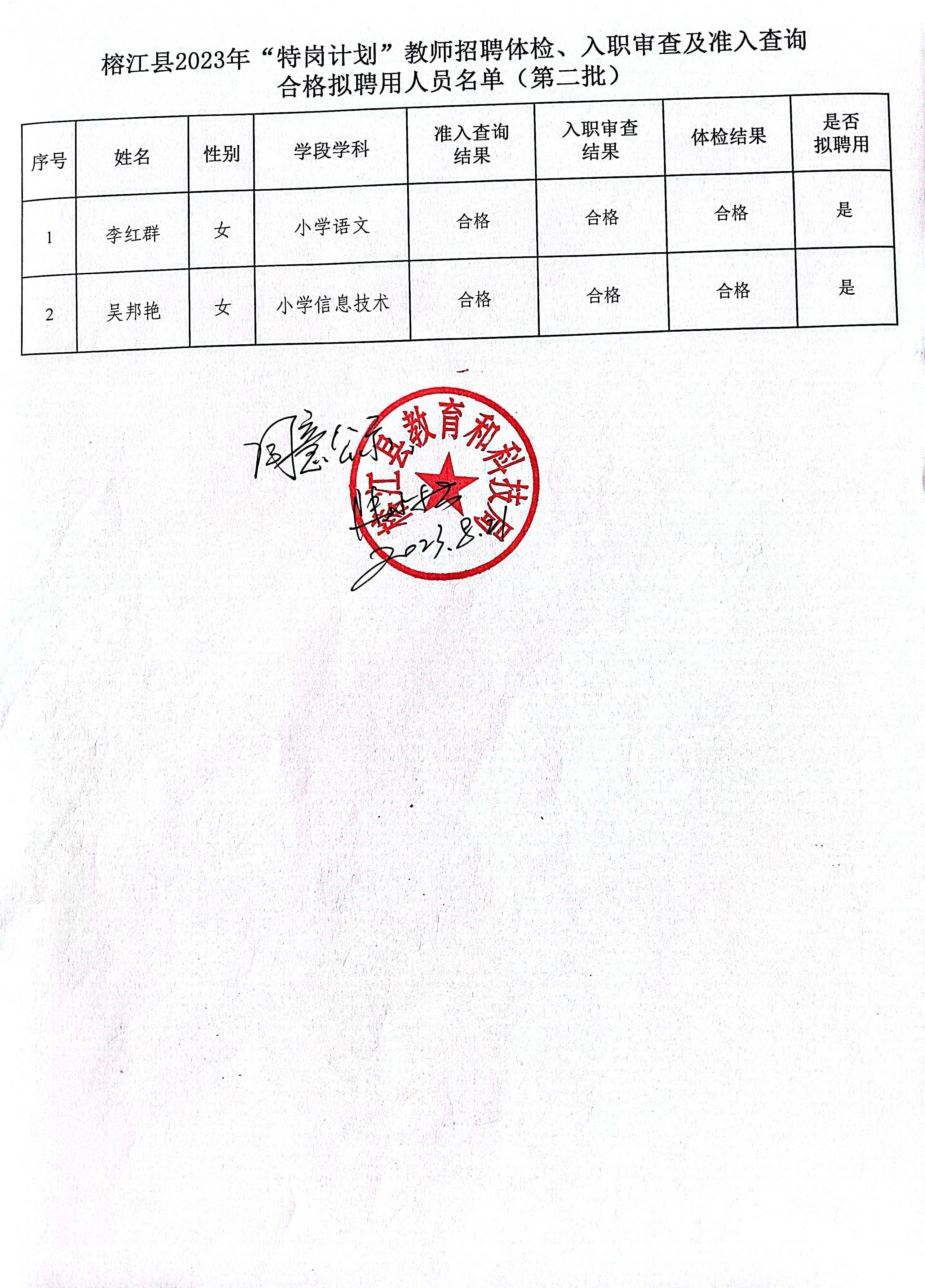 附件:榕江縣2023年“特崗計劃”教師招聘體檢、入職審查及準入查詢合格擬聘用人員名單(第二批2人).xls